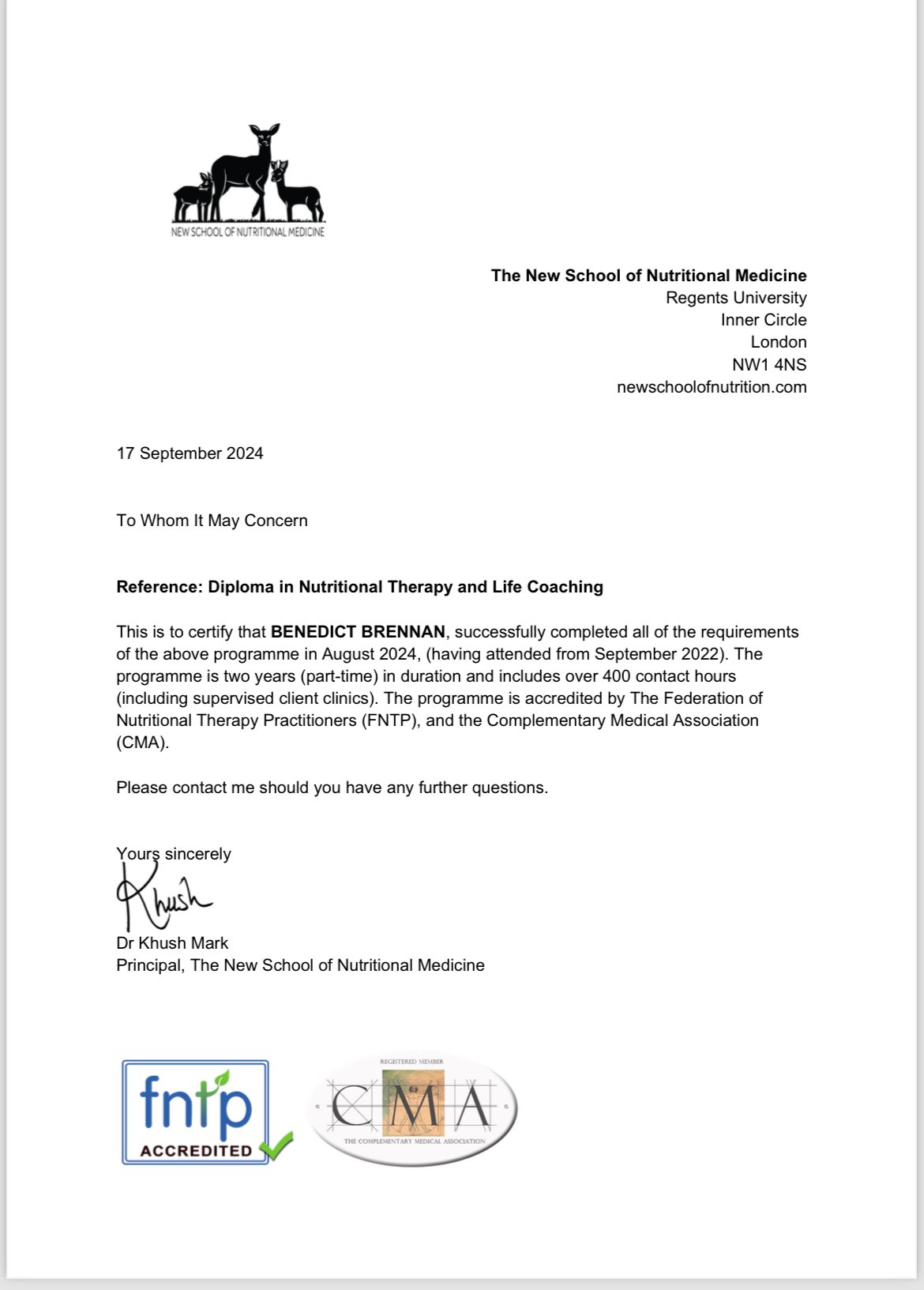 I studied Nutritional Medicine and Integrative Coaching with Dr Khush Mark PhD at the New School of Nutritional Medicine in London UK.